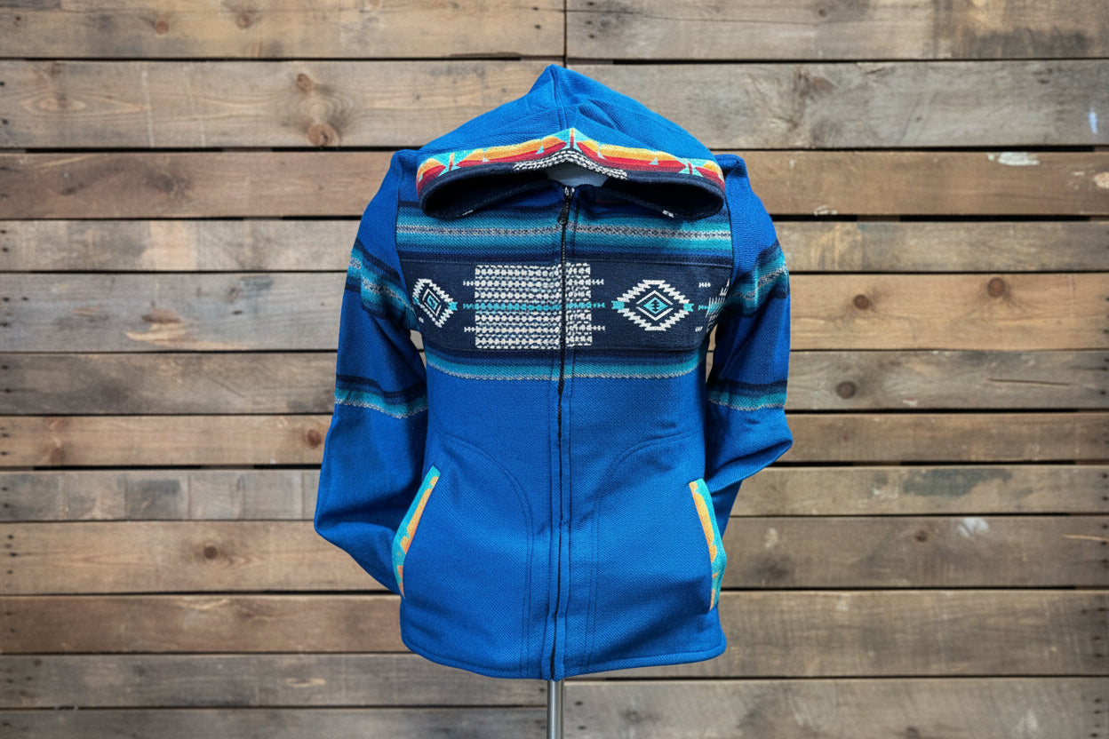 Colors: Jacket is black, red or brown with varied colored geometric weaving.