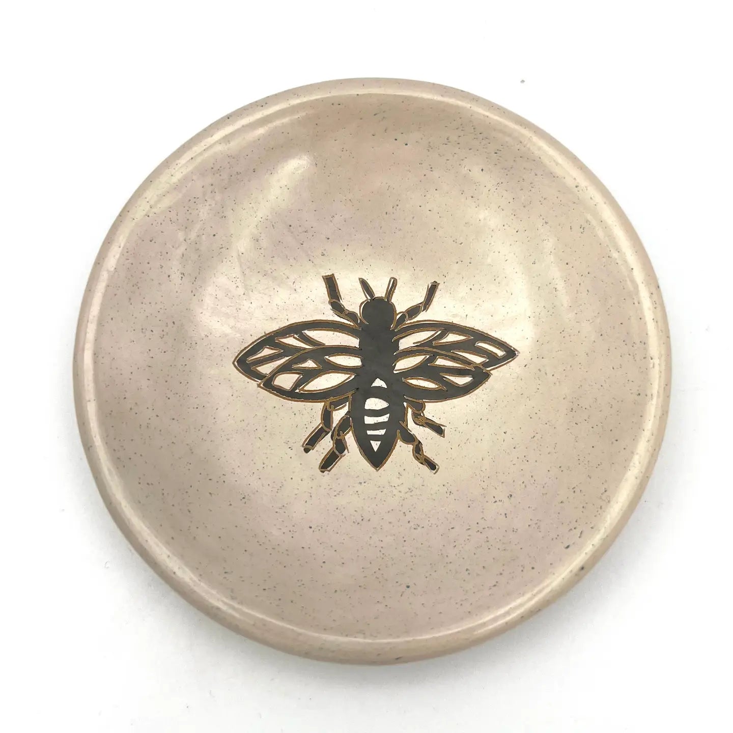 Decorate your nightstand with one of our sweet "little bee" ring plates. Created by our ceramic artisan partners in San Juan de Oriente Nicaragua, each piece is thrown on a non-electric kick wheel, etched with a bicycle spoke, and finally, wood kiln-fired. For decorative use only. Not food safe. 4.5" diameter. Fair trade.