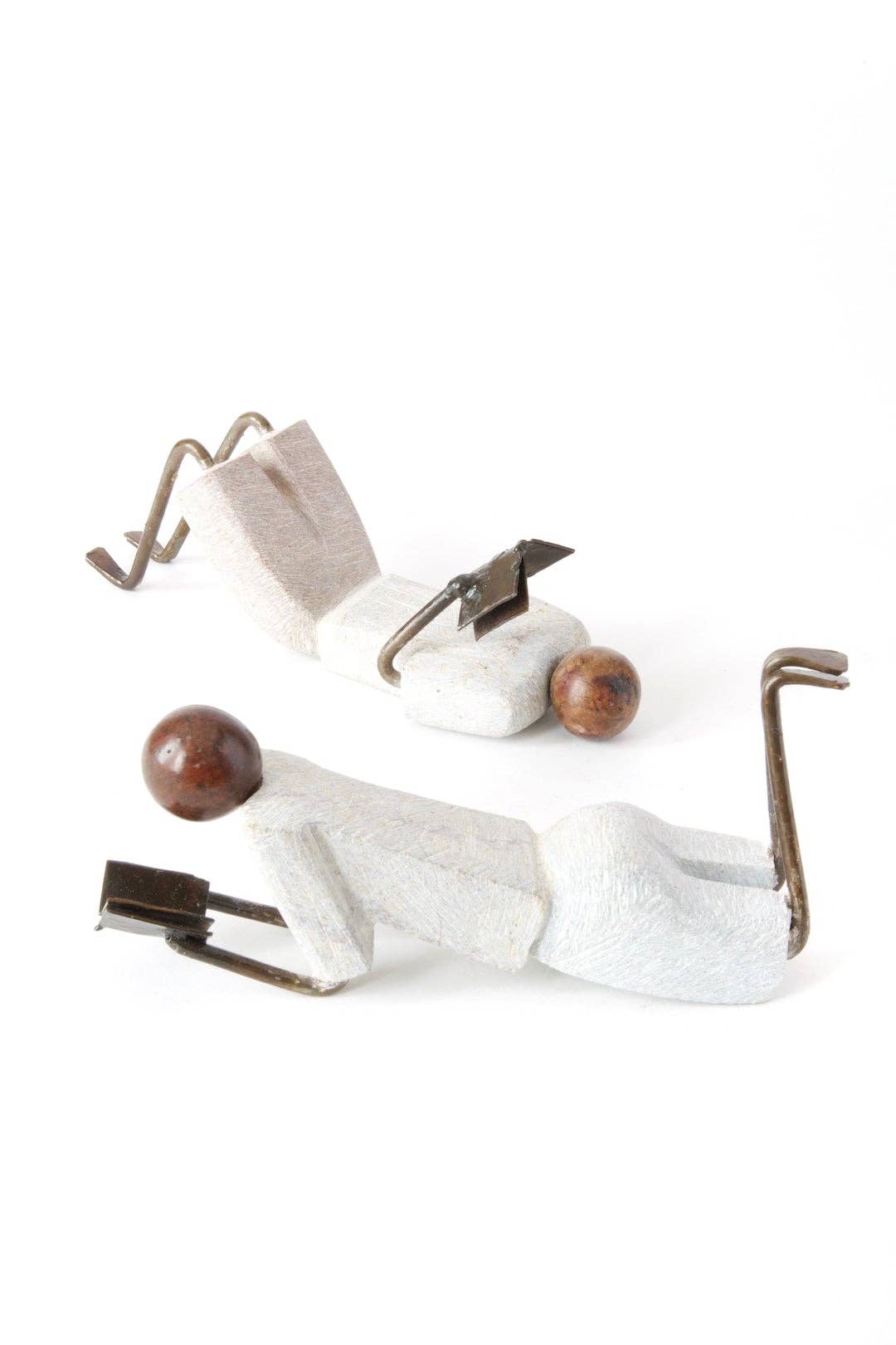 Zimbabwean artist Luke Jimu combines textured pale serpentine stone and recycled metal to create a serene line of people figures. This set of two boys reading makes a thoughtful gift for bookworms or teachers.