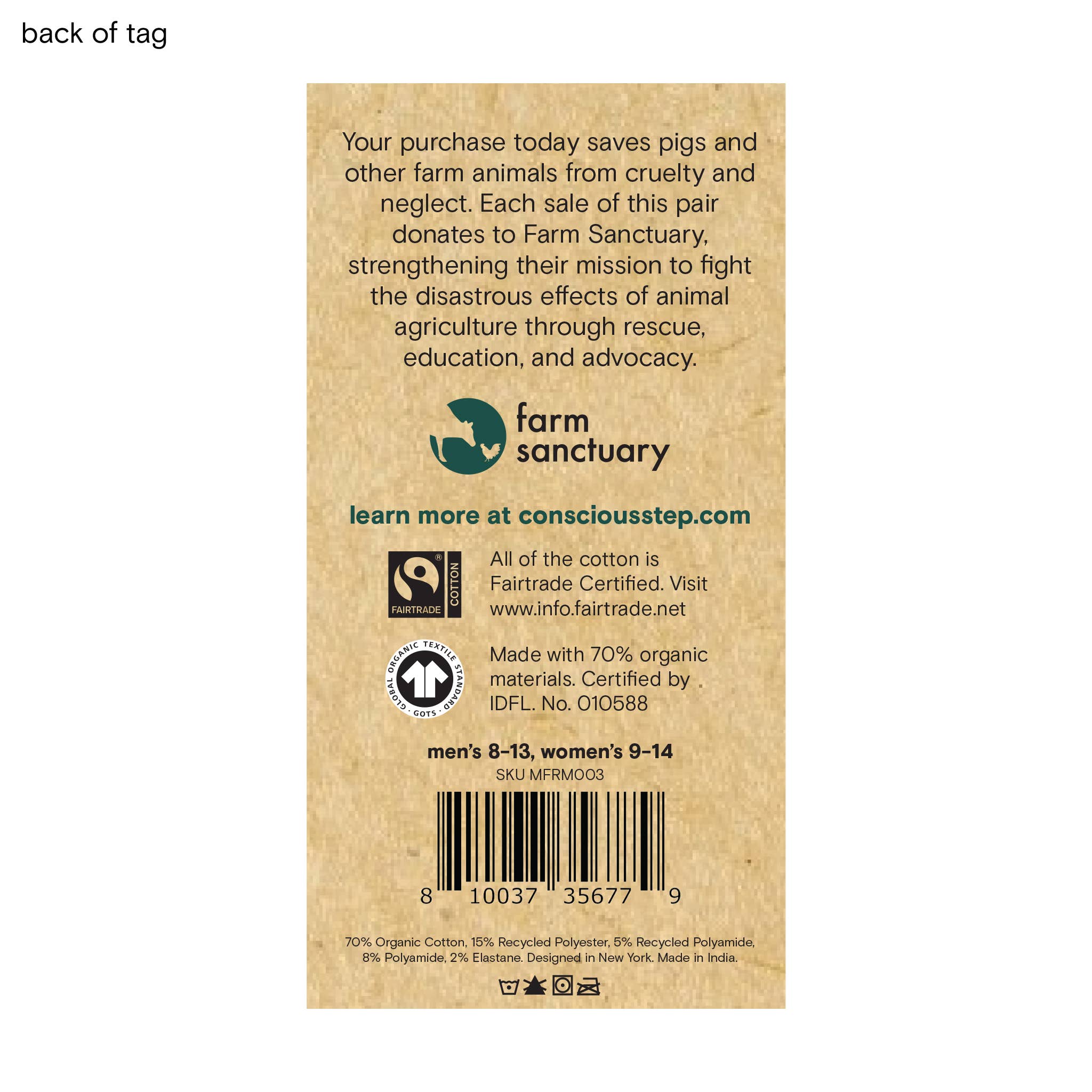 These olive green goat socks might be our greatest of all time. Featuring curious grazing goats, it’s a style that others in your sock drawer might be hard to bleat. • Each pair helps fight to save the lives of farm animals through Farm Sanctuary’s lifesaving rescue, education, and advocacy work. • Small fits women’s US shoe sizes 5-9, men's US shoe sizes 4-8, and EU shoe sizes 36-40. • Medium fits women’s US shoe sizes 9-14, men's US shoe sizes 8-13, and EU shoe sizes 41-47. • Sustainable • Certified Organic • Certified Fairtrade • Certified Vegan • Members of 1% for the Planet